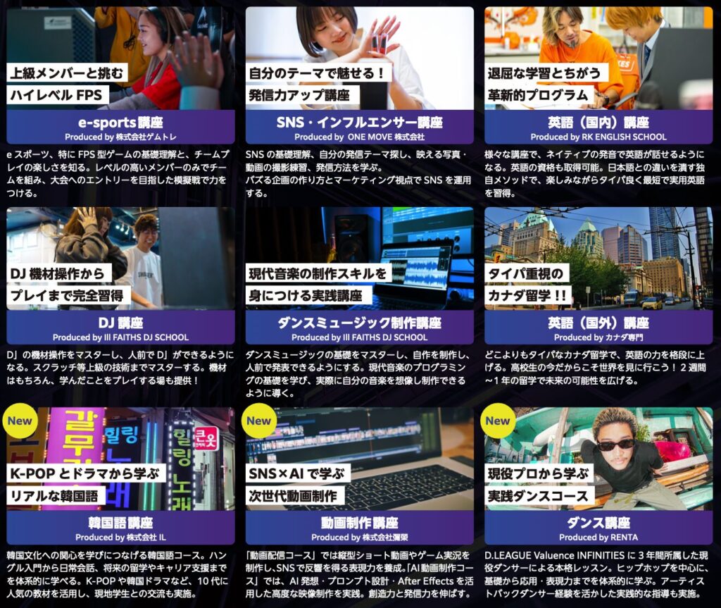 第1弾は、e-sports、インフルエンサー、英語、DJ、ダンスミュージック制作、留学の6講座!